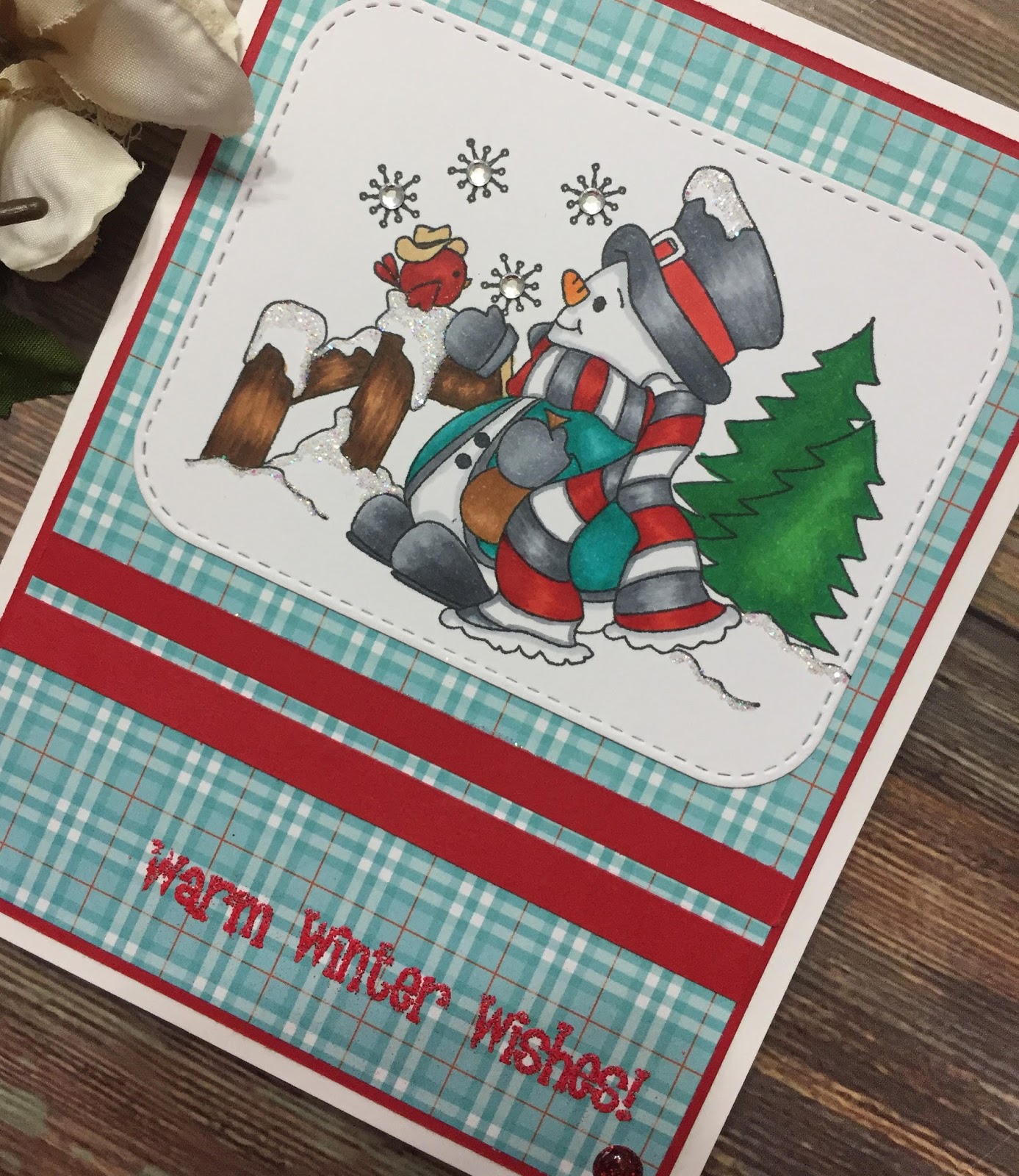 I stamped the image with my Momento Black ink, colored with copic markers, added some glitter to the snow and his hat, then embossed the red Warm Winter Wishes with red glittery embossing powder....so fun!